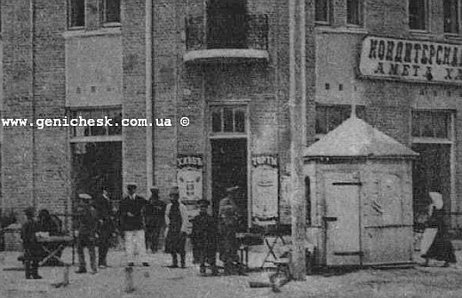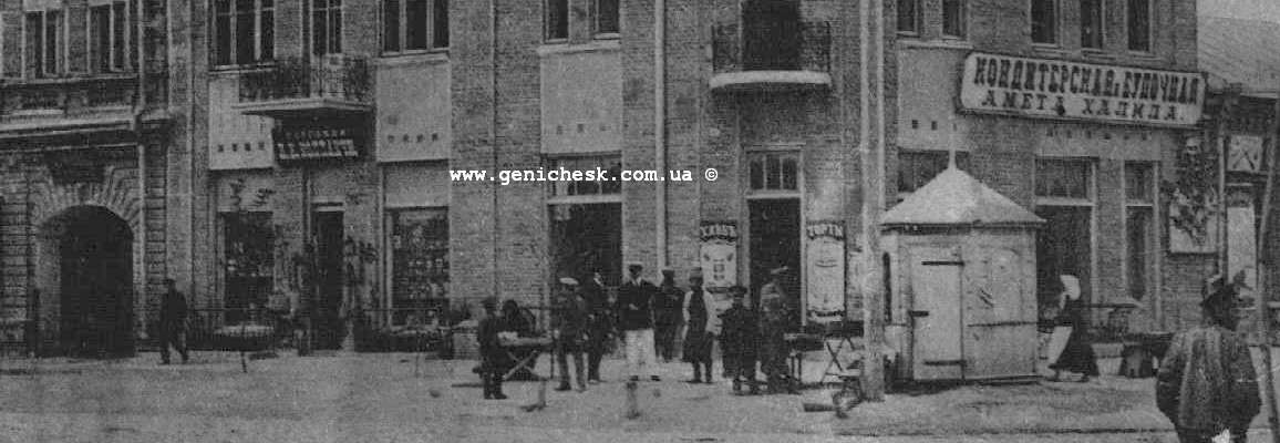Дореволюционная фотооткрытка Геническа. Кондитерская и булочная Амета Халида располагалась в Геническе на углу ул.Навицкаго и ул.Соборной.