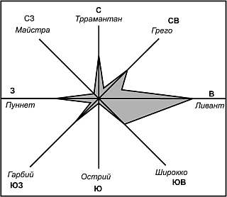 Кстати, «роза ветров» указывает повторяемость ветра различных румбов, для нашего случая он приблизительно будет выглядеть так: