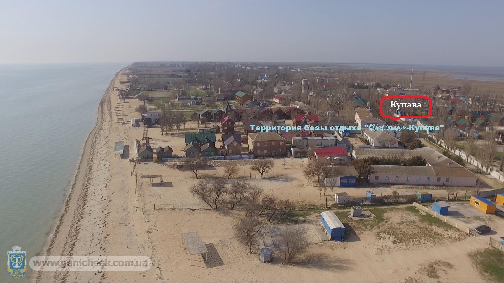 Расположение базы отдыха Купава в Генгорке на Арабатской стрелке относительно моря и пляжа на аэрофотосъемке