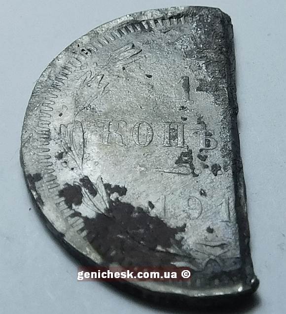 Эти 15 копеек времен правления Николая второго выступили в качестве "сдачи" Да, да, именно так. Кому-то надо было дать или получить сдачу с серебряных 15 копеек. Поступили просто - монету перерубили пополам.