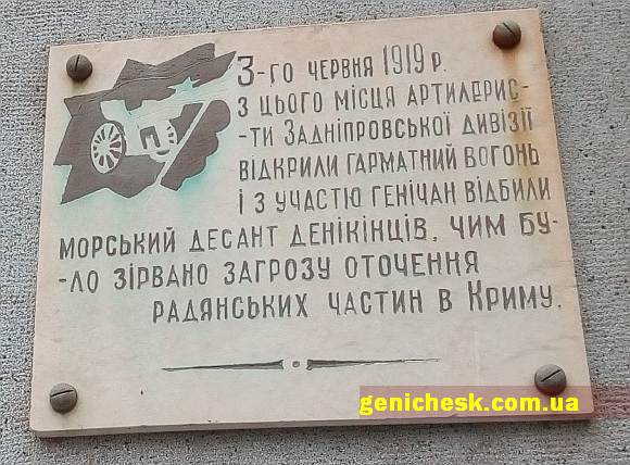 Место откуда 3 июня 1919 года артиллеристы Заднепровской дивизии открыли пушечный огонь и с помощью геничан отбили морской десант деникинцев чем была сорвана угроза окружения советских частей в Крыму.